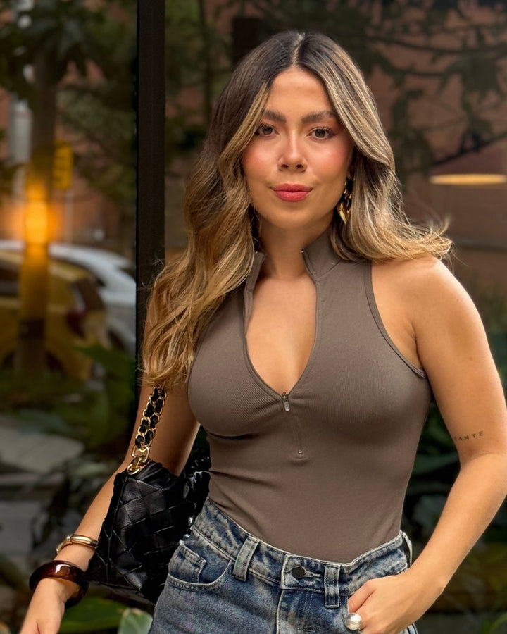 Presenta un escote profundo en forma de lágrima con cierre metálico funcional, ideal para graduar el nivel de apertura según el estilo deseado - Su diseño sin mangas y corte limpio en espalda lo convierte en una prenda versátil para combinar con jeans, faldas o pantalones de vestir.