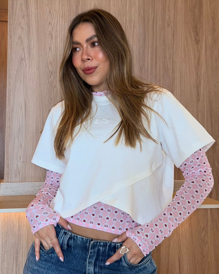 - Su diseño destaca por el corte asimétrico en la parte frontal, que aporta un toque actual y estilizado, y por el bordado minimalista “ES.” al centro del pecho, que añade un detalle limpio y sofisticado.