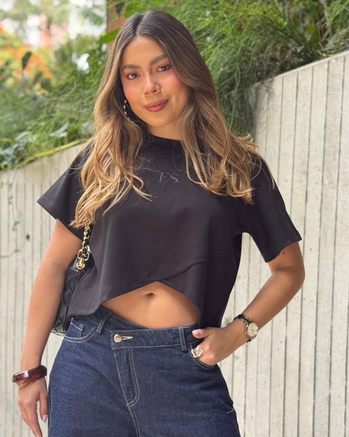 - Su diseño destaca por el corte asimétrico en la parte frontal, que aporta un toque actual y estilizado, y por el bordado minimalista “ES.” al centro del pecho, que añade un detalle limpio y sofisticado.