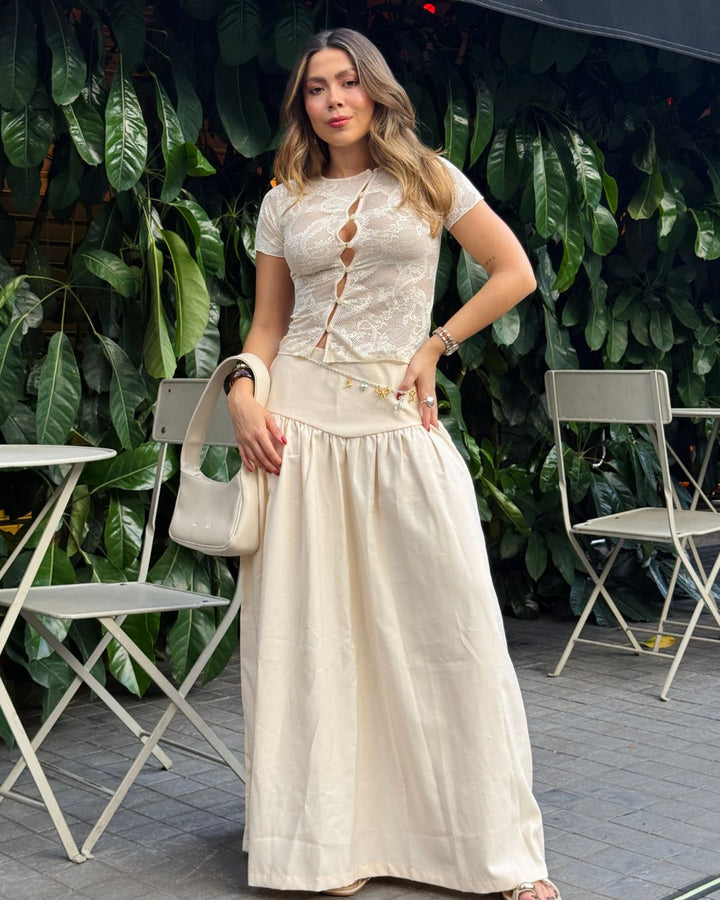 - Su diseño presenta una pretina ancha que se ajusta cómodamente a la cintura y una falda amplia con recogido sutil que aporta volumen y un toque romántico.