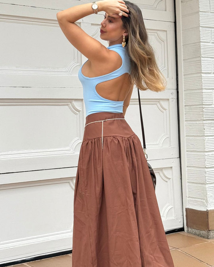 - Su diseño presenta una pretina ancha que se ajusta cómodamente a la cintura y una falda amplia con recogido sutil que aporta volumen y un toque romántico.
