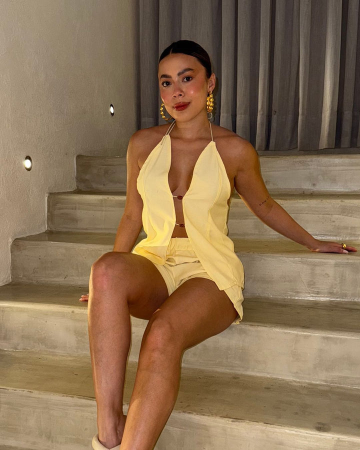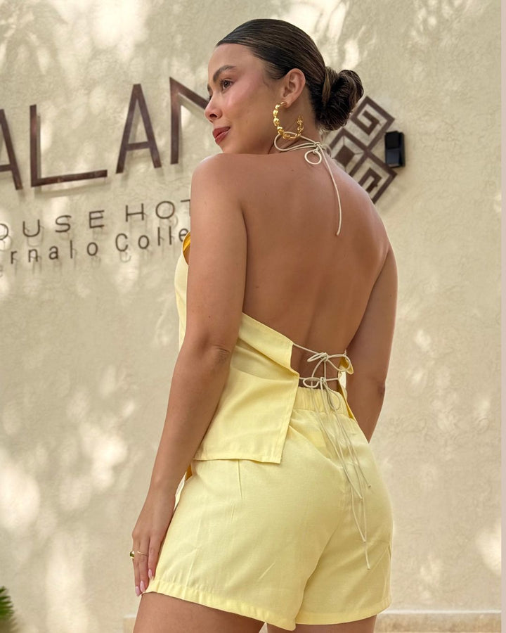 - Compuesto por un top halter abierto con espalda descubierta y shorts de cintura elástica