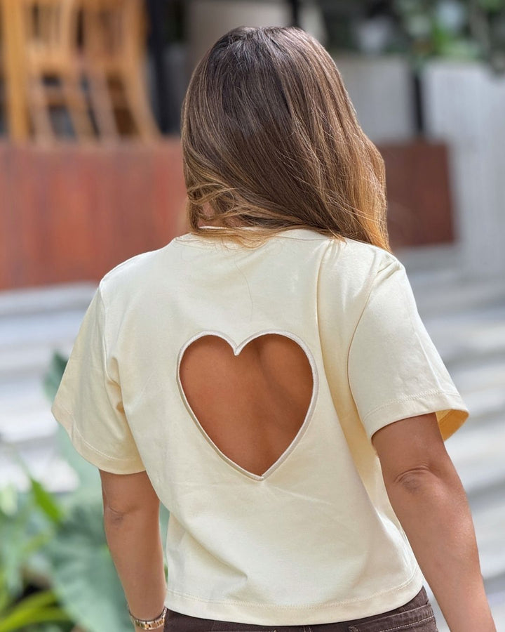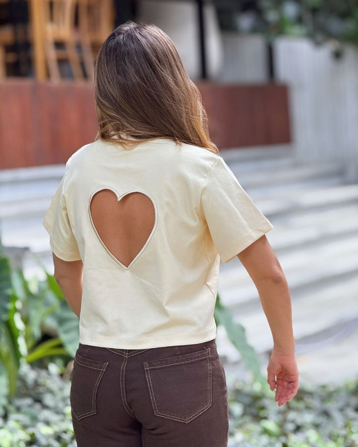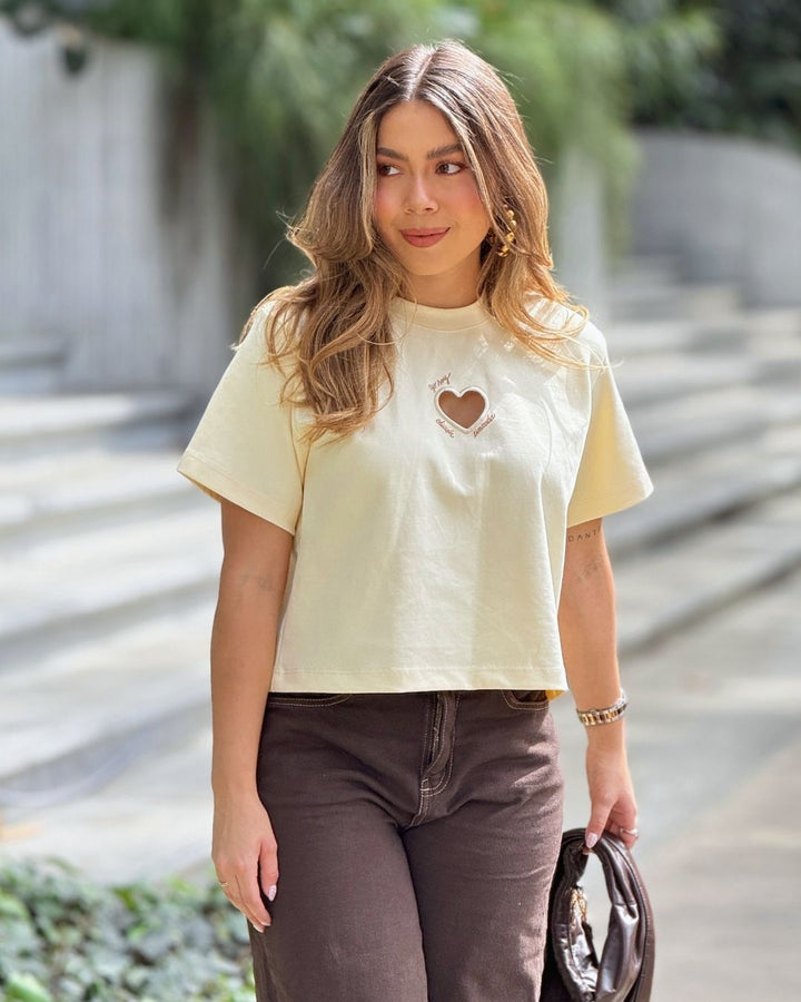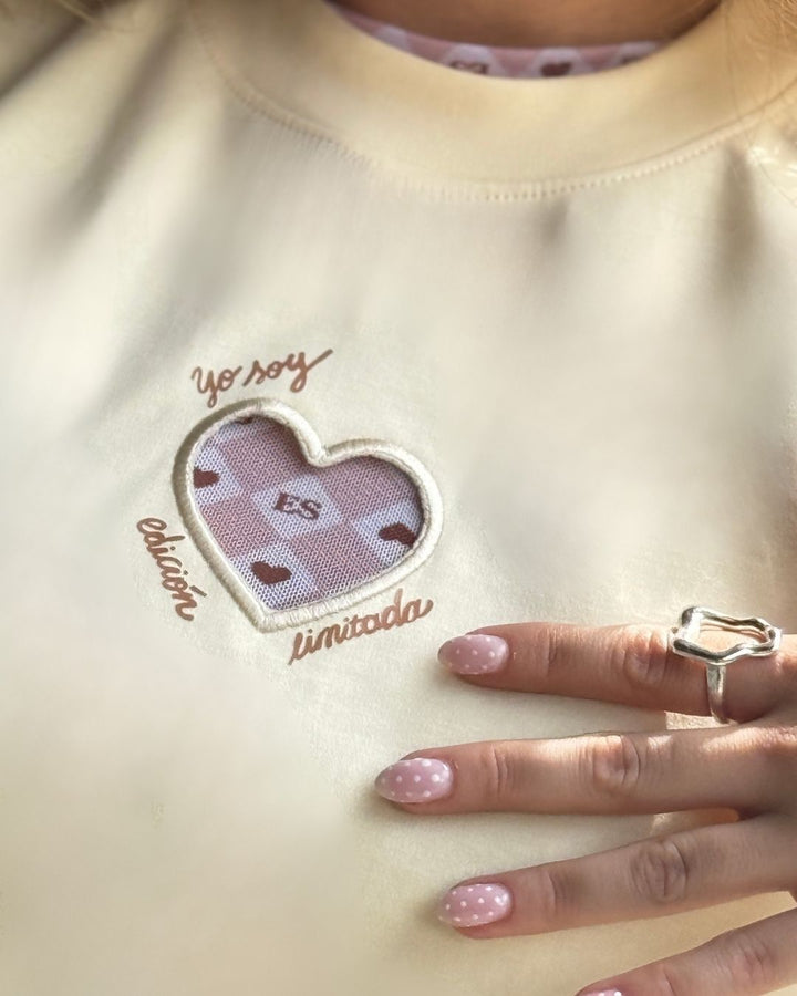 - Su detalle principal es el corazón recortado en la parte frontal, acompañado de un bordado estampado que agrega personalidad y encanto.